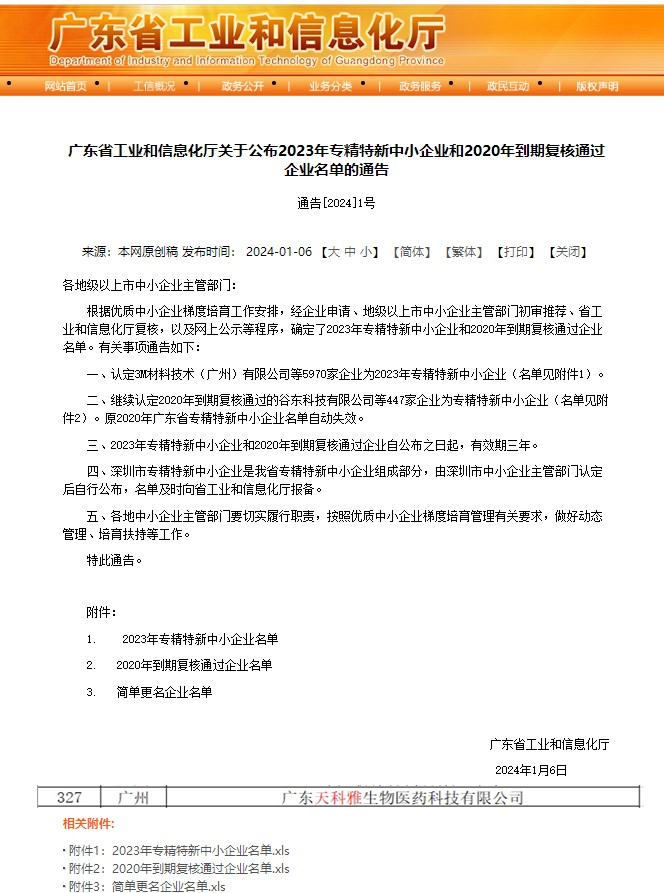 2024年1月6日,廣東省工業(yè)和信息化廳公示2023年專精特新中小企業(yè)名單,經(jīng)過(guò)市區(qū)推薦,合規(guī)審查,專家評(píng)審等,天科雅榜上有名,喜獲廣東省“專精特新”中小企業(yè)認(rèn)定。