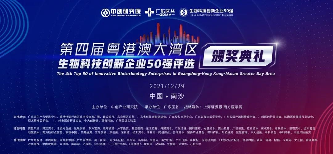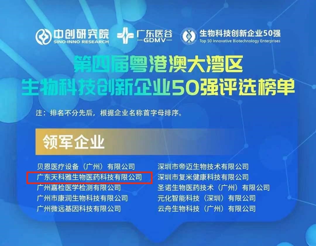 2021年12月29日,第四屆粵港澳大灣區(qū)生物科技創(chuàng)新企業(yè)50強(qiáng)頒獎典禮暨生物科技創(chuàng)新發(fā)展峰會將于廣州南沙舉辦,現(xiàn)場進(jìn)行第四屆粵港澳大灣區(qū)生物科技創(chuàng)新企業(yè)50強(qiáng)頒獎典禮,天科雅榮獲“第四屆生物科技創(chuàng)新企業(yè)50強(qiáng)-領(lǐng)軍企業(yè)獎”。
