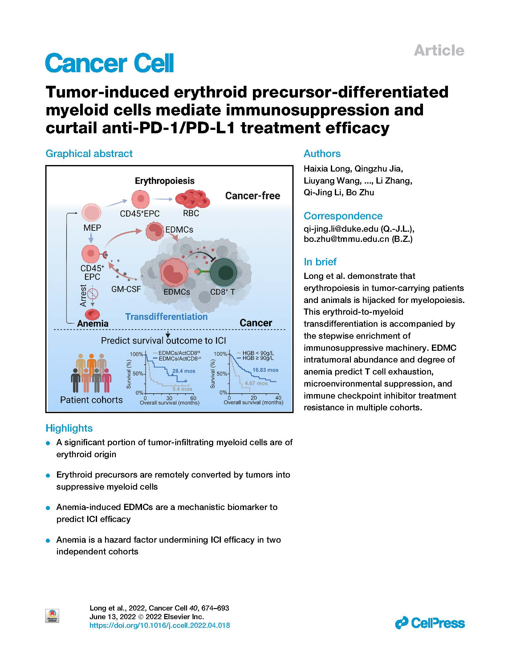 The transdifferentiation paths of erythroid precursor cells (EPCs) under the influence of tumor is delineated from Palantir algorithm‐based single-cell transcriptomic trajectory analysis (Long et al., 674–693), and embedded into artwork inspired by Wassily Kandinsky's “Composition 8.” As acquired “organs,” tumors exert a self-beneficial influence on the immune system by hijacking of erythropoiesis for myelopoiesis. Besides exacerbating anemia, CD45+ EPCs transdifferentiation generates myeloid cells that robustly curtail anti‐tumor immunity. Clinically, the abundance of these converted cells predicts immune tolerance in many human tumor types and resistance to immune checkpoint inhibitor treatment. Design and painting by Yijie Hou. Conceptual visualization by Qi-Jing Li and Bo Zhu.
