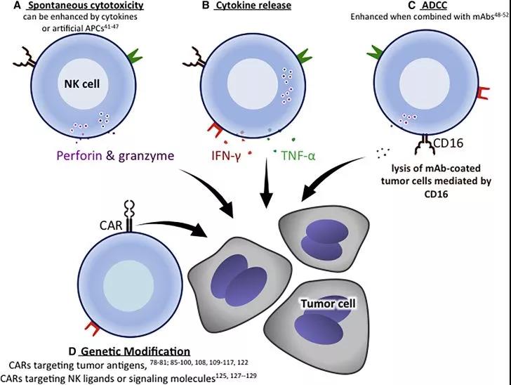 NK細(xì)胞來(lái)源非常廣泛,比如外周血、臍帶血、胚胎干細(xì)胞、人類誘導(dǎo)多能干細(xì)胞和NK細(xì)胞系,不同來(lái)源的NK細(xì)胞有著各自的優(yōu)勢(shì)和缺陷。由于NK細(xì)胞可以經(jīng)歷的細(xì)胞分裂數(shù)量有限,很難擴(kuò)增為輸注所需的大量細(xì)胞。因此,研究者們逐步使用NK細(xì)胞系(如NK-92、YTS、KHYG-1等)代替從臍帶或外周血獲得的原代NK細(xì)胞進(jìn)行了研究。