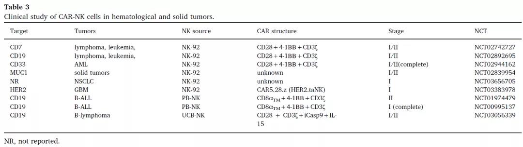 ▲ CAR-NK細(xì)胞在血液瘤和實(shí)體瘤中的臨床研究