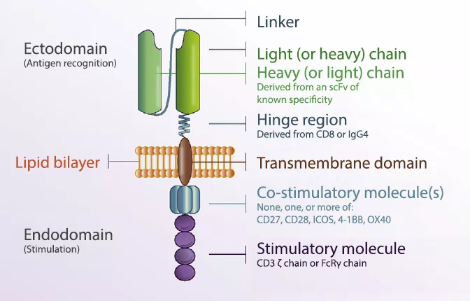 首先, 讓我們簡單回顧下CAR-T療法的作用機(jī)制, CAR(嵌合抗原受體)是一種基因工程技術(shù)制造的人工受體分子,它可以賦予免疫效應(yīng)細(xì)胞(如T淋巴細(xì)胞)針對某個(gè)靶點(diǎn)抗原表位的特異性,從而增強(qiáng)T淋巴細(xì)胞識別抗原信號與活化的功能,繼而回輸淋巴細(xì)胞以實(shí)現(xiàn)抗腫瘤的作用。