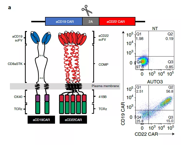 2021年10月12日,Nature Medicine期刊上公布了抗CD19和抗CD22 CAR的自體轉(zhuǎn)導(dǎo)T細(xì)胞(AUTO3)在復(fù)發(fā)性或難治性B-ALL(n=15)的兒童和年輕成年患者中的I期試驗(yàn),以評估AUTO3的療效。